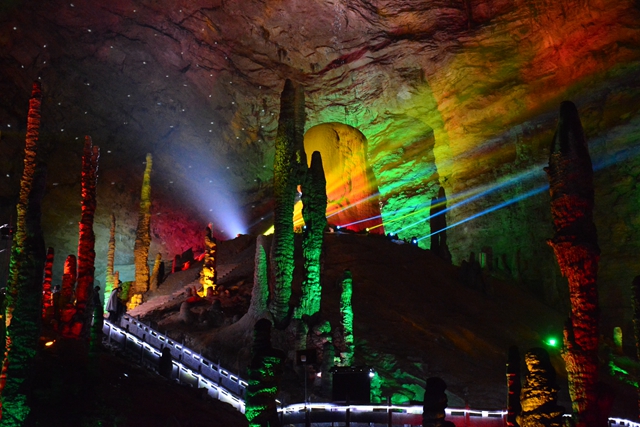 如果您既想幸福又想長(zhǎng)壽,那么您不妨先選擇一道門進(jìn)洞,出洞的時(shí)候走另一道門,這樣就能福壽雙全,兩全其美。穿過"雙門迎賓",我們來到黃龍洞的第一個(gè)大廳--聚會(huì)廳。這個(gè)大廳可能會(huì)給大家一種豁然開朗的感覺,這里是黃龍洞十三個(gè)大廳中面積最小的一個(gè)廳,面積約 6000平方米。